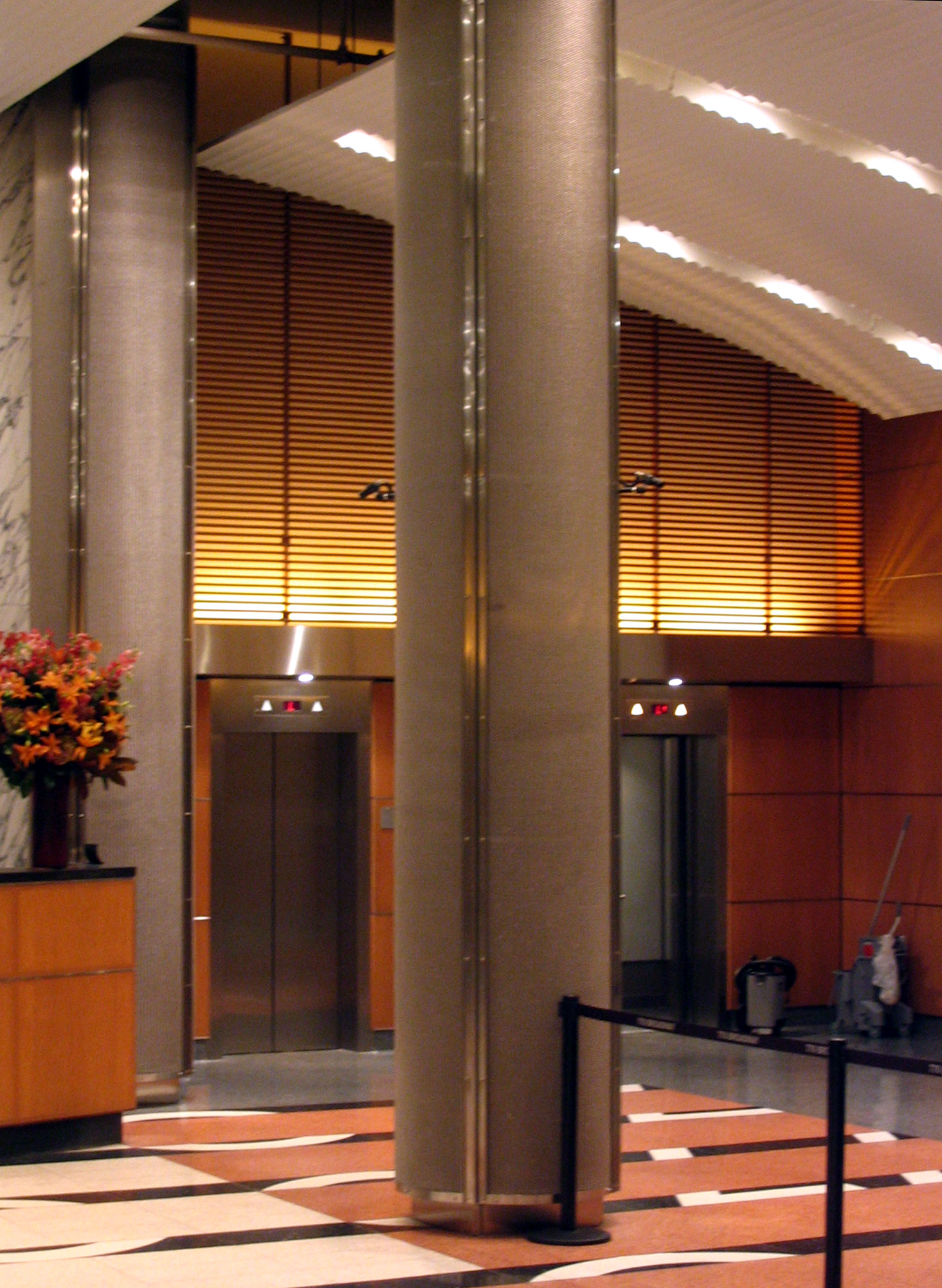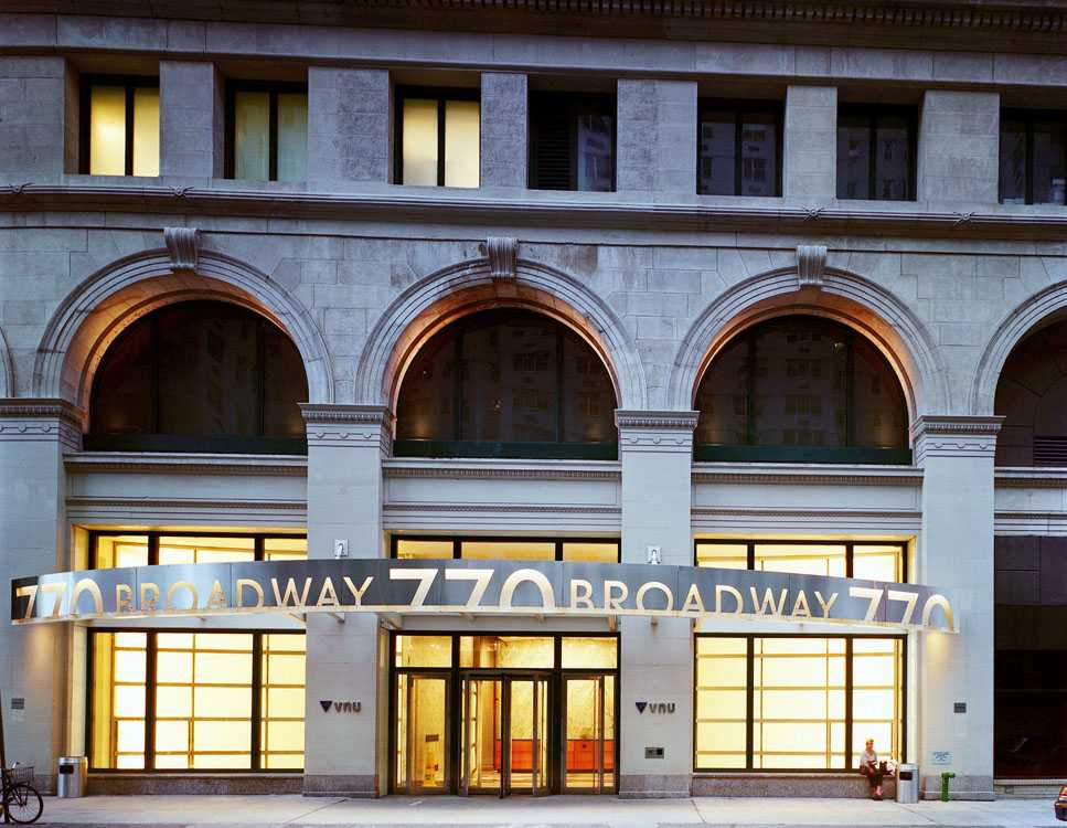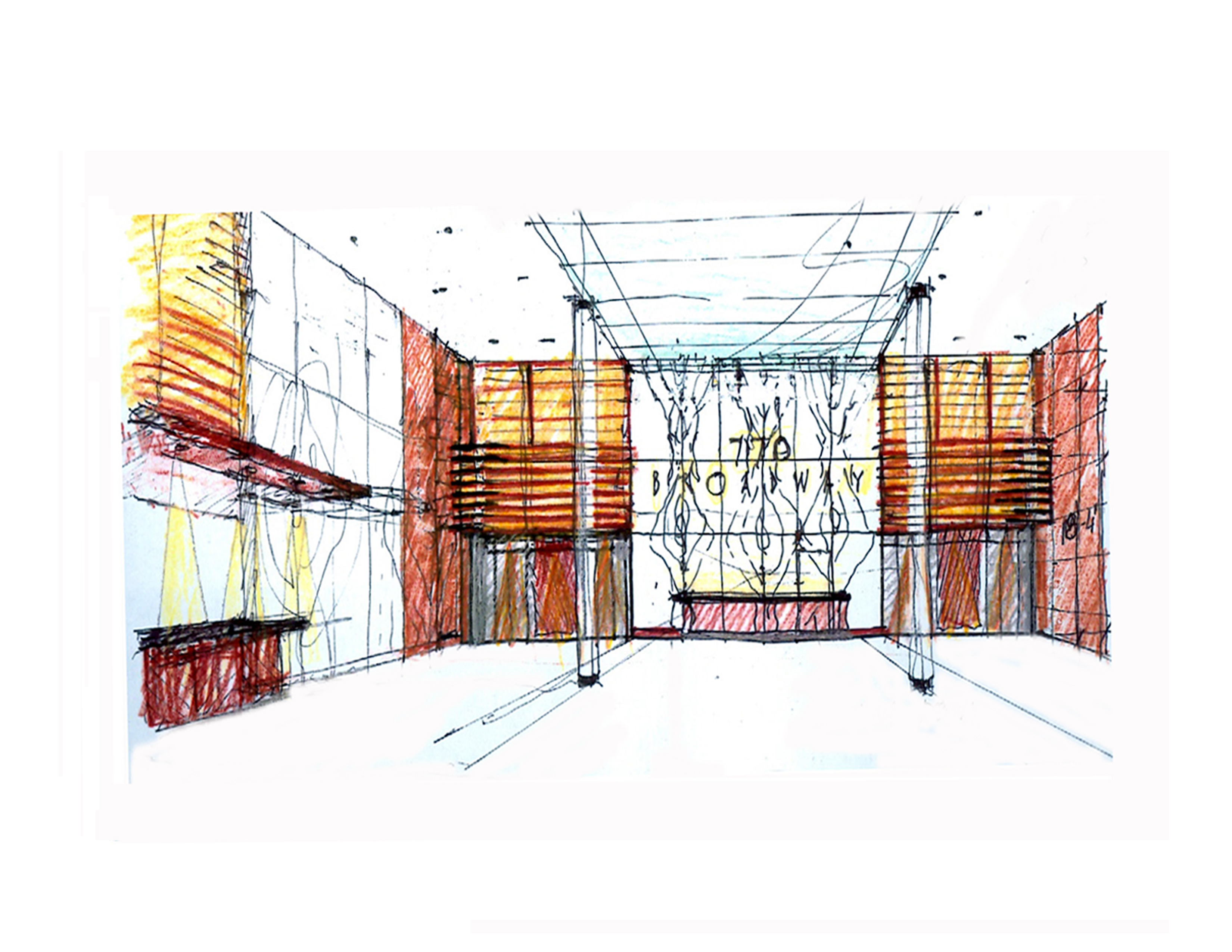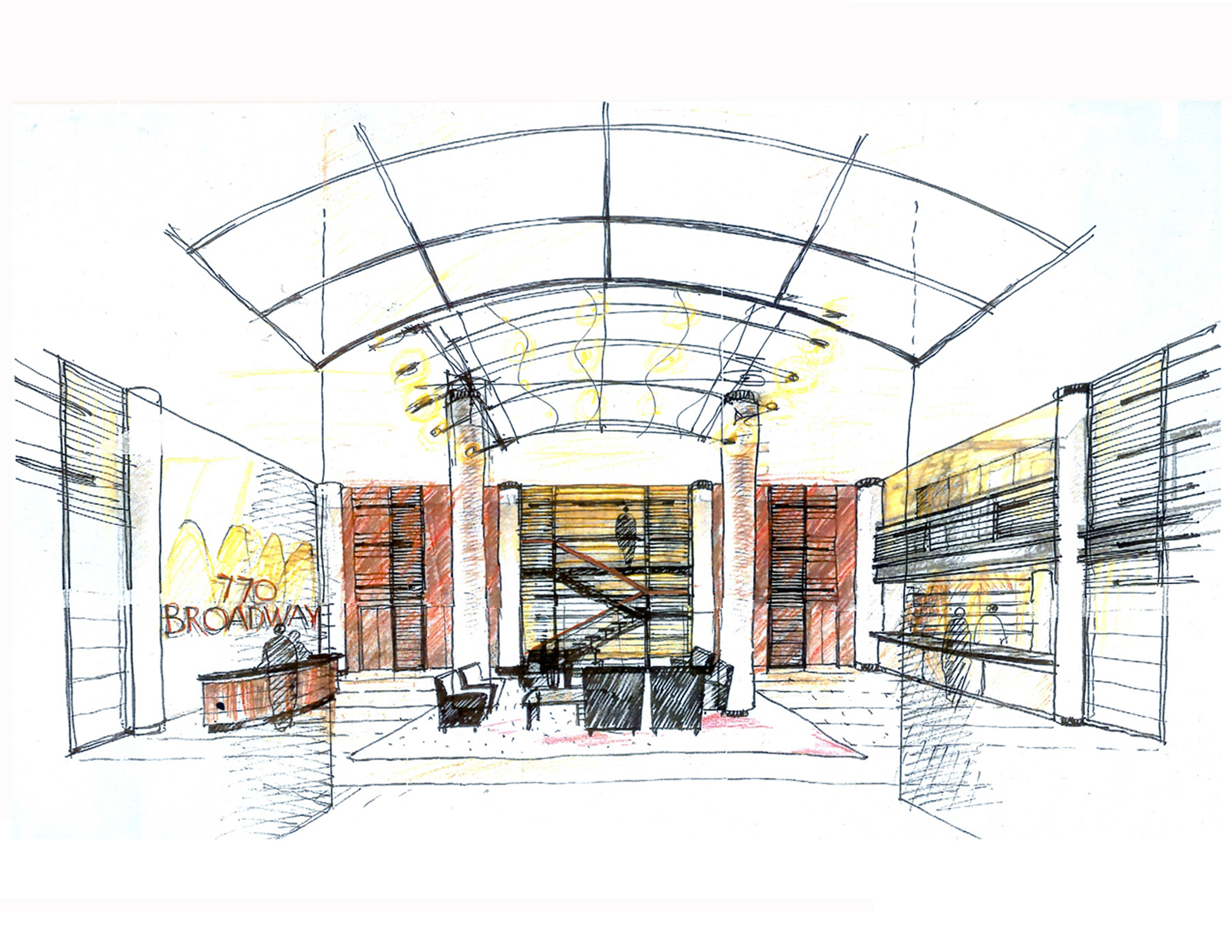 770 Broadway is part of the historic Wanamaker Department Store building that occupies a whole block next to Astor Place in Manhattan. It is the entrance and the lobby to all the office spaces above the street level. Formerly a single door, the renovation visually opened up the lobby’s presence at the street level with three illuminated arches and a large curved glass canopy that sweeps across. The sweeping arch theme continues into the lobby with new floating curved fluted panels that screen AC equipment and light fixtures. The existing bookmatching marble panels were salvaged and relocated to accommodate the new double height space of the lobby. The warmth of wood paneling and backlit grilles balances the stately white marble creating a contemporary and elegant space.