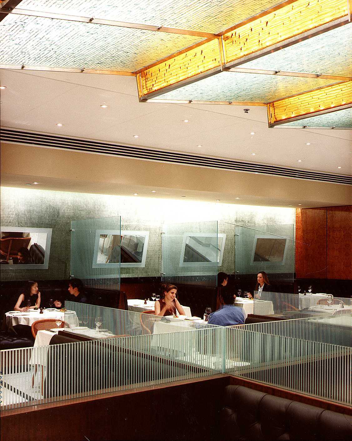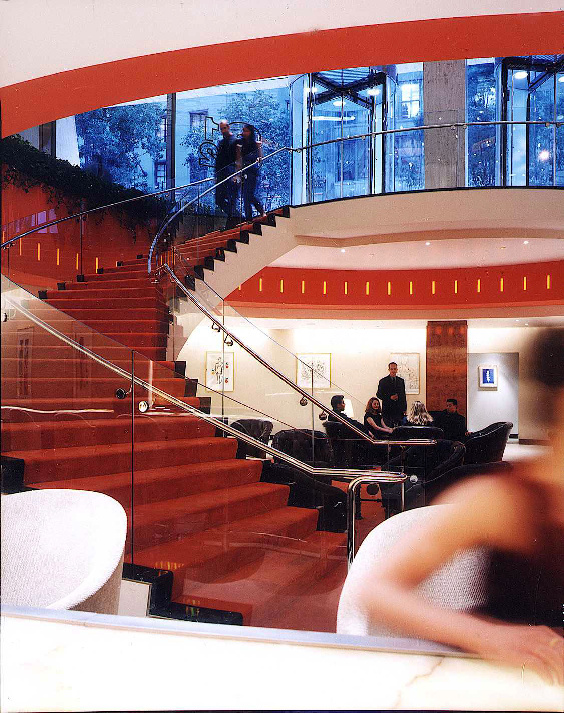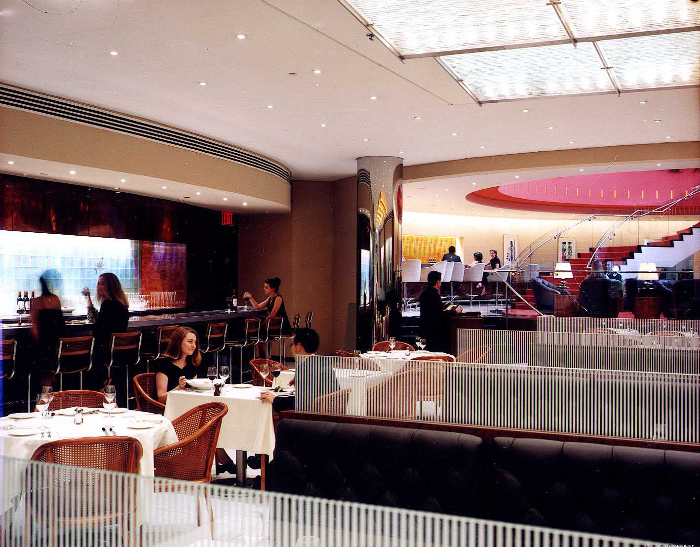 Brasserie 8 ½ is a luxury restaurant in the lower level spaces of the iconic Gordon Bunshaft building on 57th Street in Manhattan, just off 5th Avenue. The client wanted to get an elegant space that would be used by the business crowd at lunch time and for fine upscale dining in the evening. The grand half-circular staircase covered with bright orange carpet, the owner’s signature color, leads from the street level to a round cocktail lounge and bar creating a strong presence of the restaurant at the street. The entrance tactfully blends with the existing modernist lobby of the building filled with art from the owner’s private collection. To minimize the feeling of being underground, the dining room has a large light fixture/glass sculpture in the ceiling and a backlit stained glass panel that screens the kitchen entrance as a focal point.