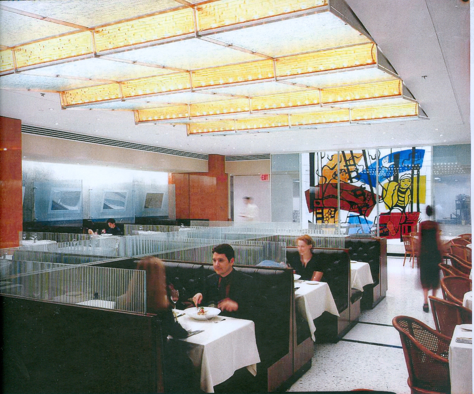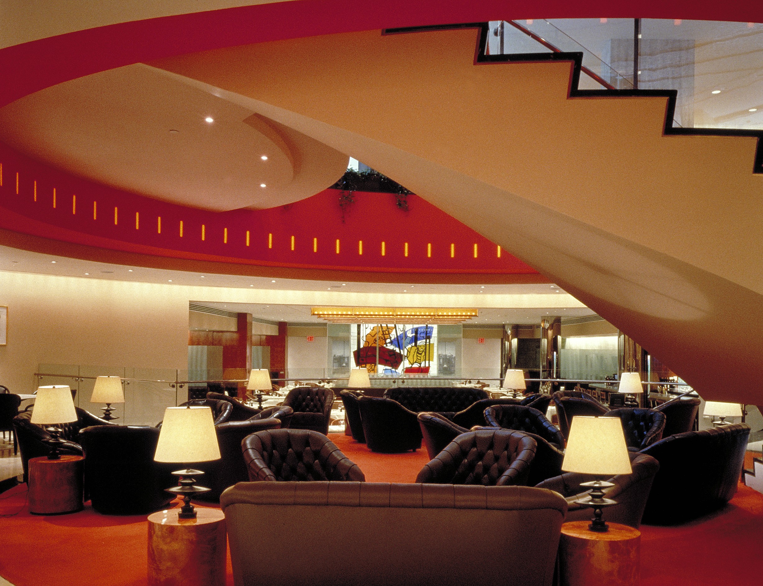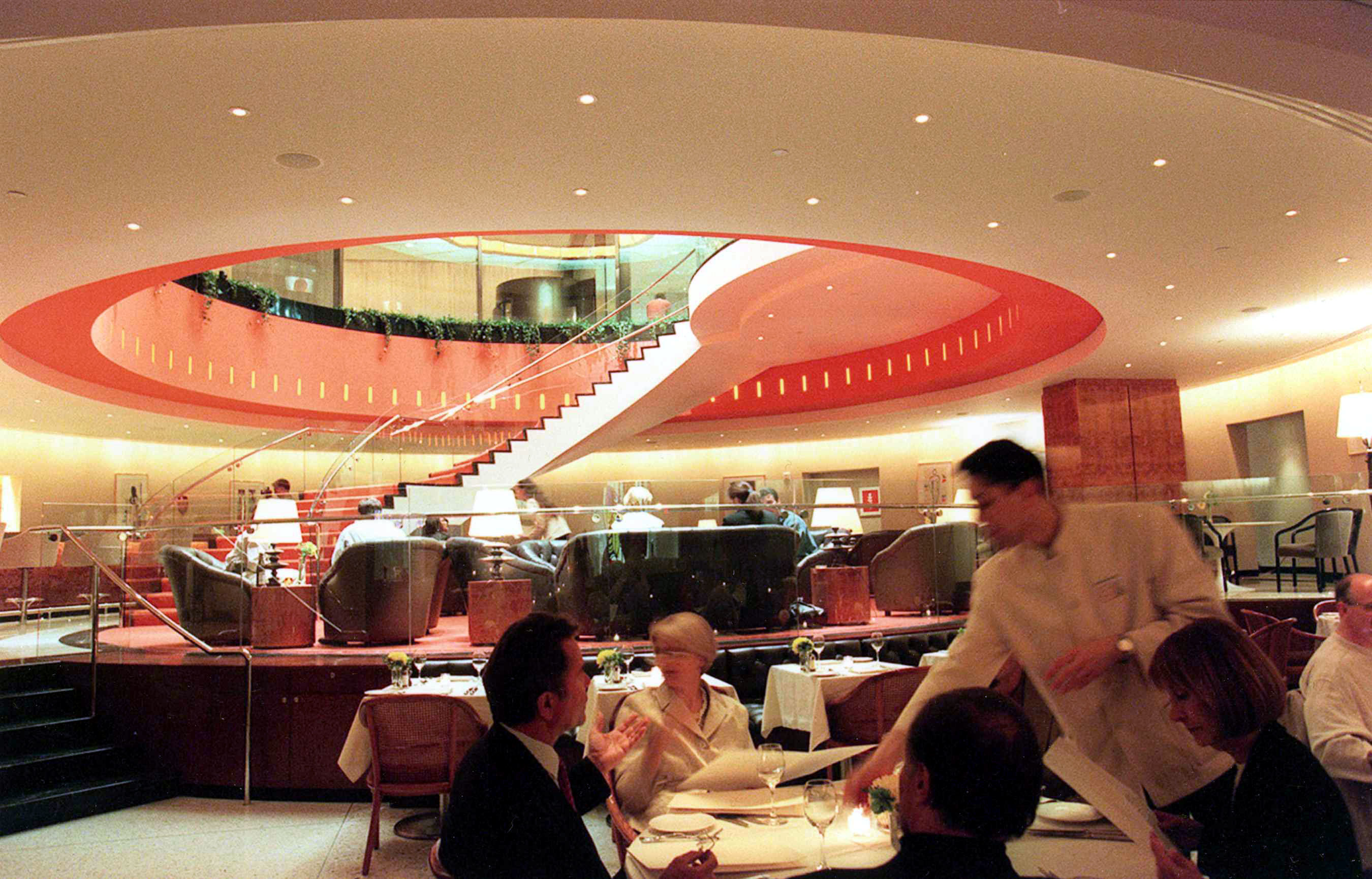 Brasserie 8 ½ is a luxury restaurant in the lower level spaces of the iconic Gordon Bunshaft building on 57th Street in Manhattan, just off 5th Avenue. The client wanted to get an elegant space that would be used by the business crowd at lunch time and for fine upscale dining in the evening. The grand half-circular staircase covered with bright orange carpet, the owner’s signature color, leads from the street level to a round cocktail lounge and bar creating a strong presence of the restaurant at the street. The entrance tactfully blends with the existing modernist lobby of the building filled with art from the owner’s private collection. To minimize the feeling of being underground, the dining room has a large light fixture/glass sculpture in the ceiling and a backlit stained glass panel that screens the kitchen entrance as a focal point.