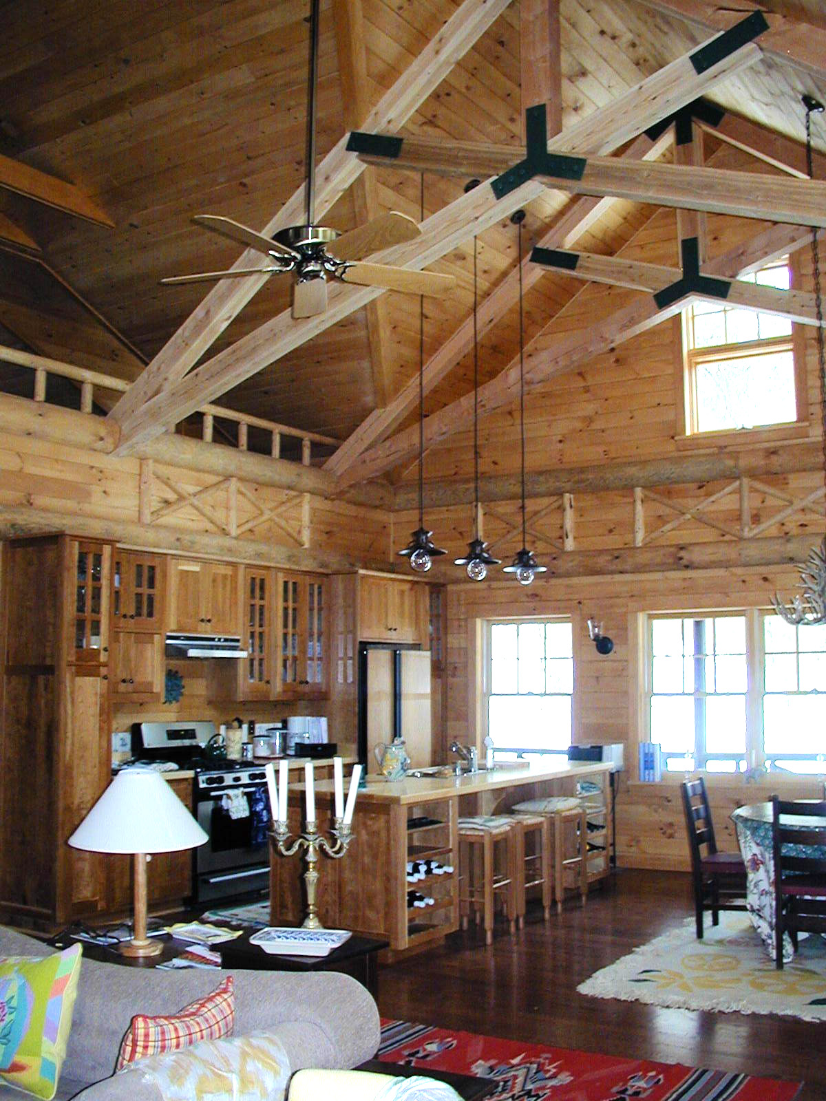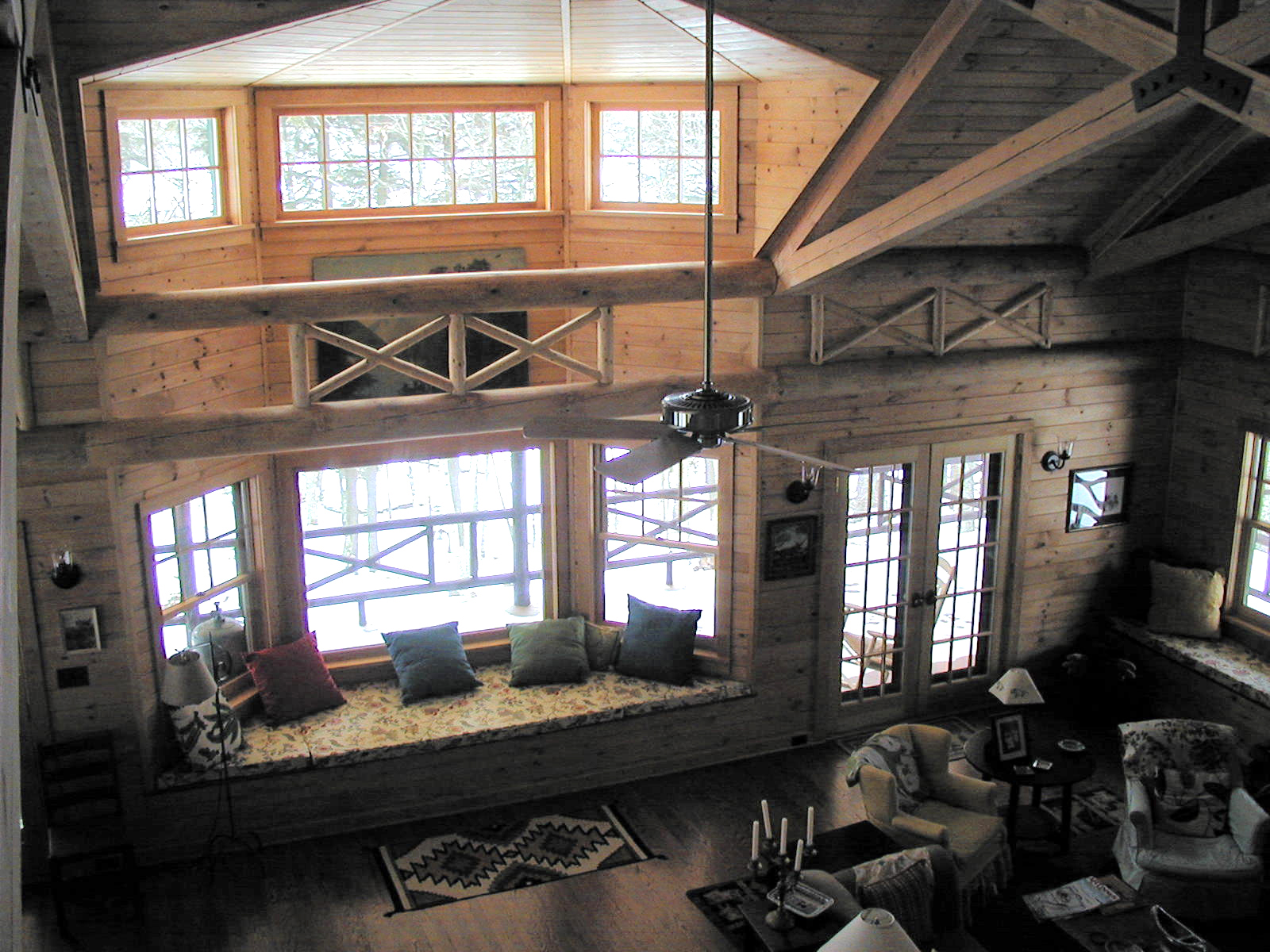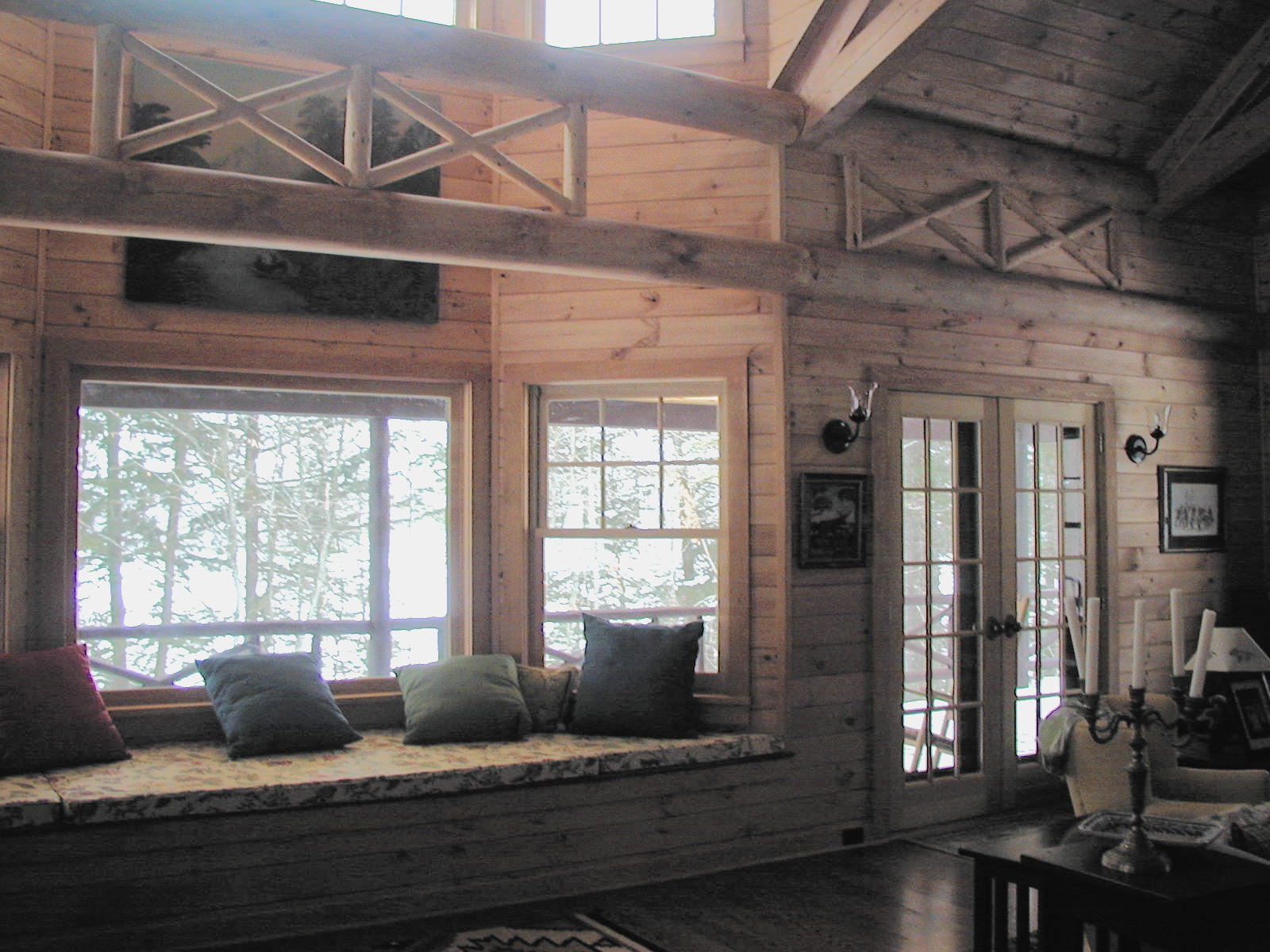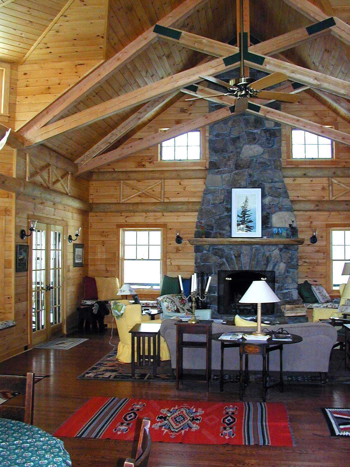 A new construction, this waterfront cabin is located on Little Moose Lake in the Adirondack League Club in upstate New York. The owners wanted a building using the Great Camp style traditional to the region, with its rustic detailing and a grand room with a cathedral ceiling and open wood trusses.