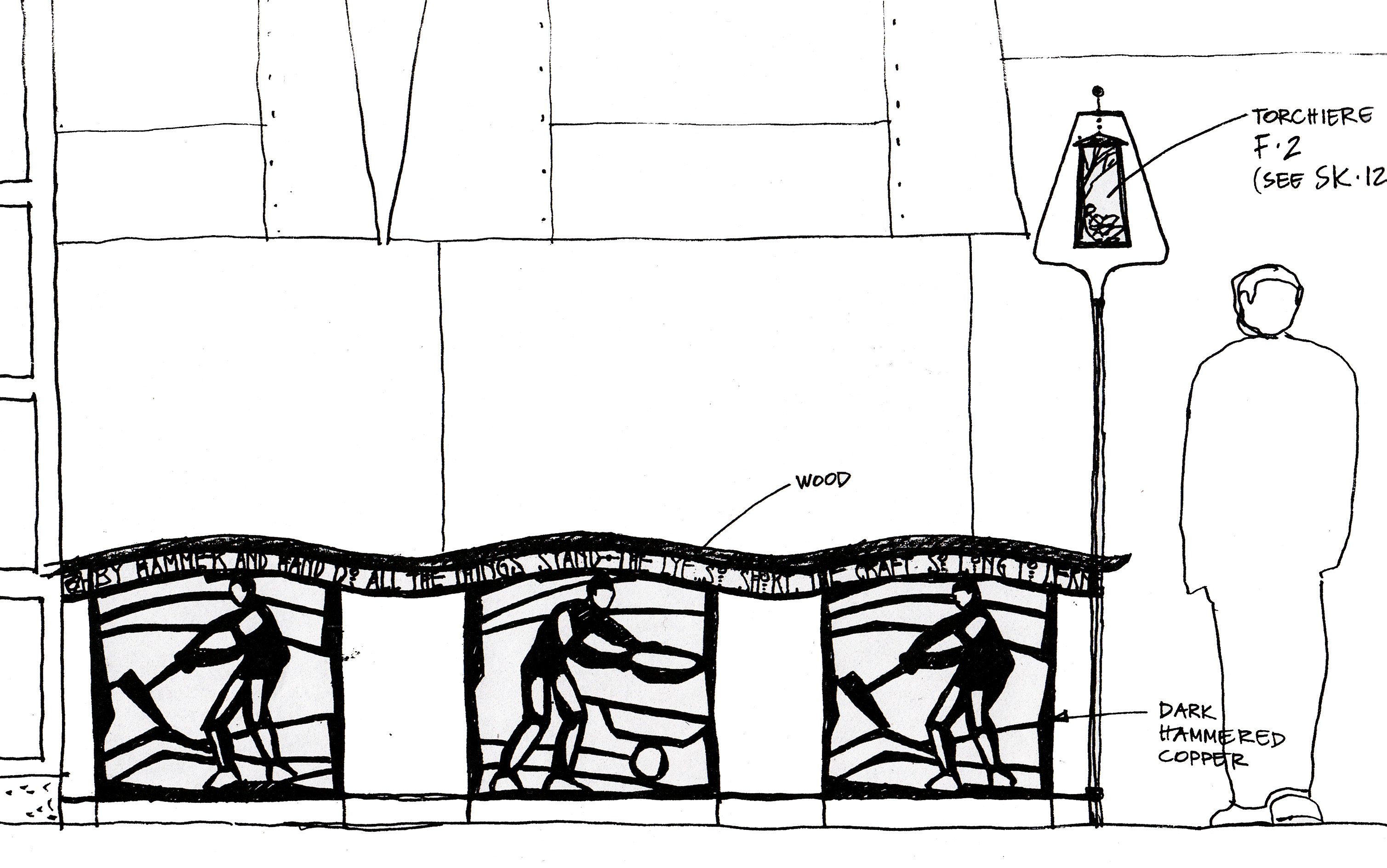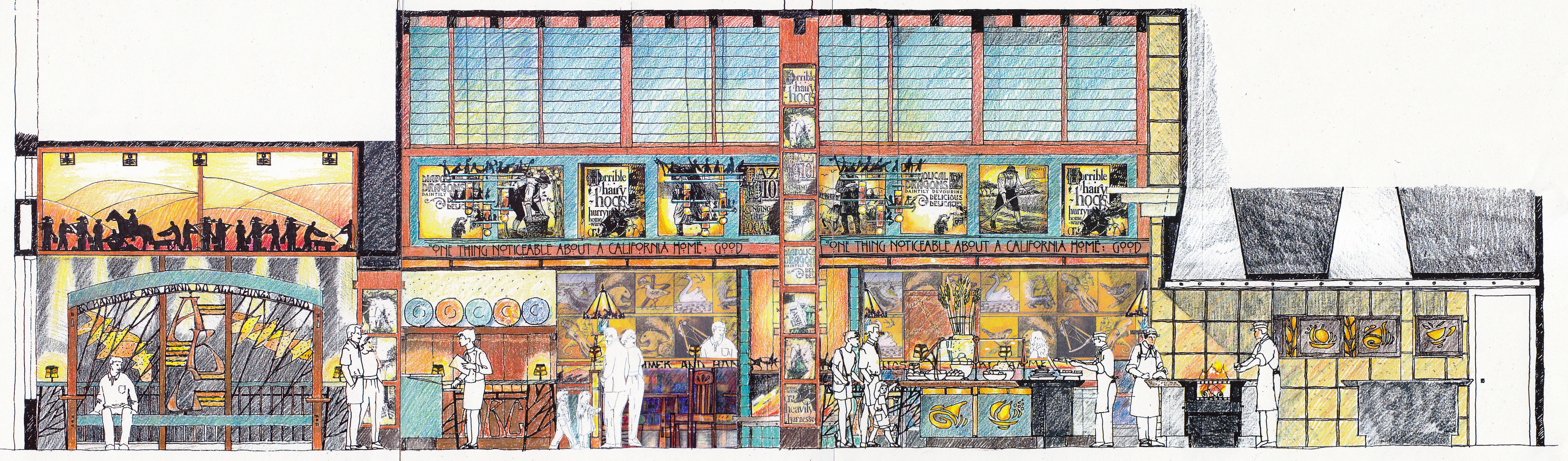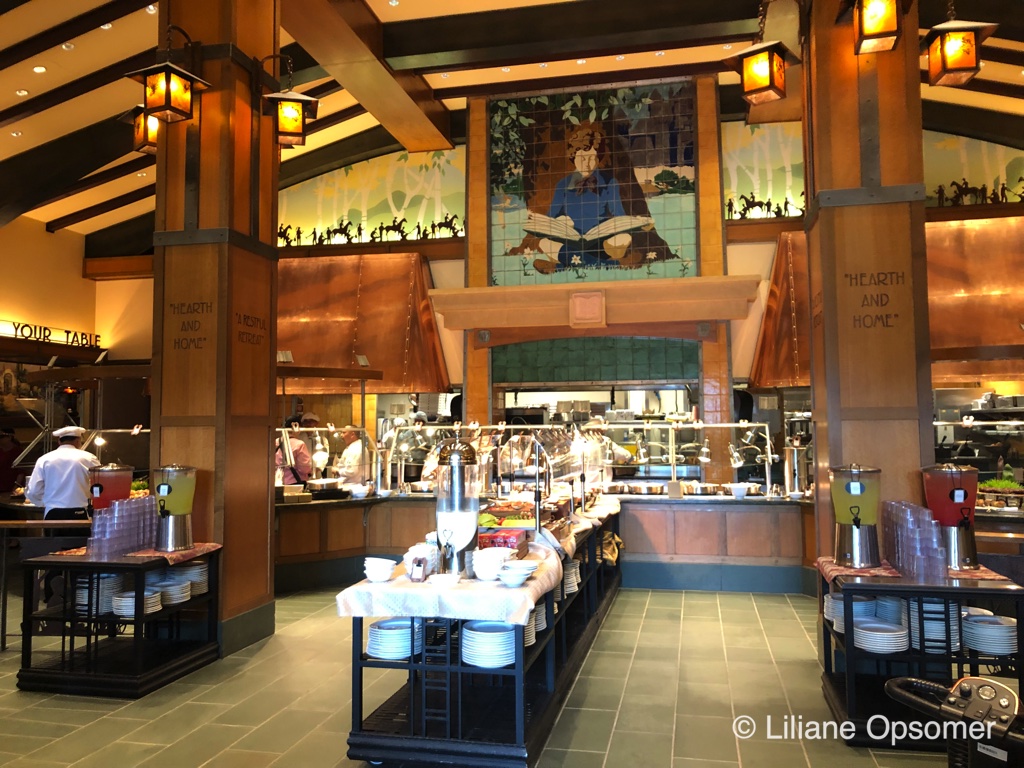 Storytellers Café at the Grand Californian Hotel (Disneyland Park, Anaheim) is a family restaurant with capacity for 325 seats. It allows for different types of seating from booths and large round tables to small tables for two. In a usual Disney theme park approach, it is focused on the theme of America’s Storytelling with images by N.C. Wyeth of 19th century pioneers discovering the West and Native American legends. The interior décor is inspired by the Arts-and-Crafts style, visually rich and layered with a wide range of materials. The client’s wish was to create a large scale grand dining room that at the same time carries a lot of smaller intricate detail, with always something new to discover and look at.