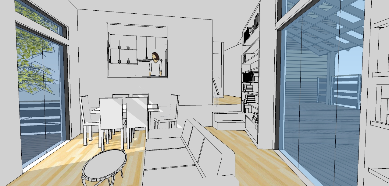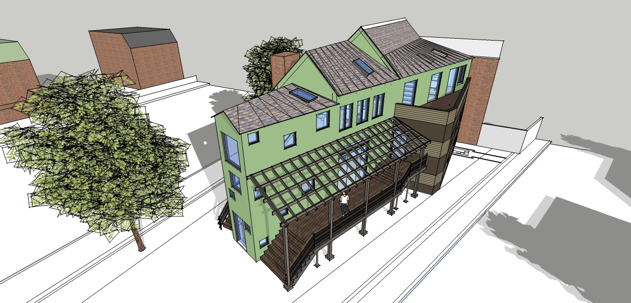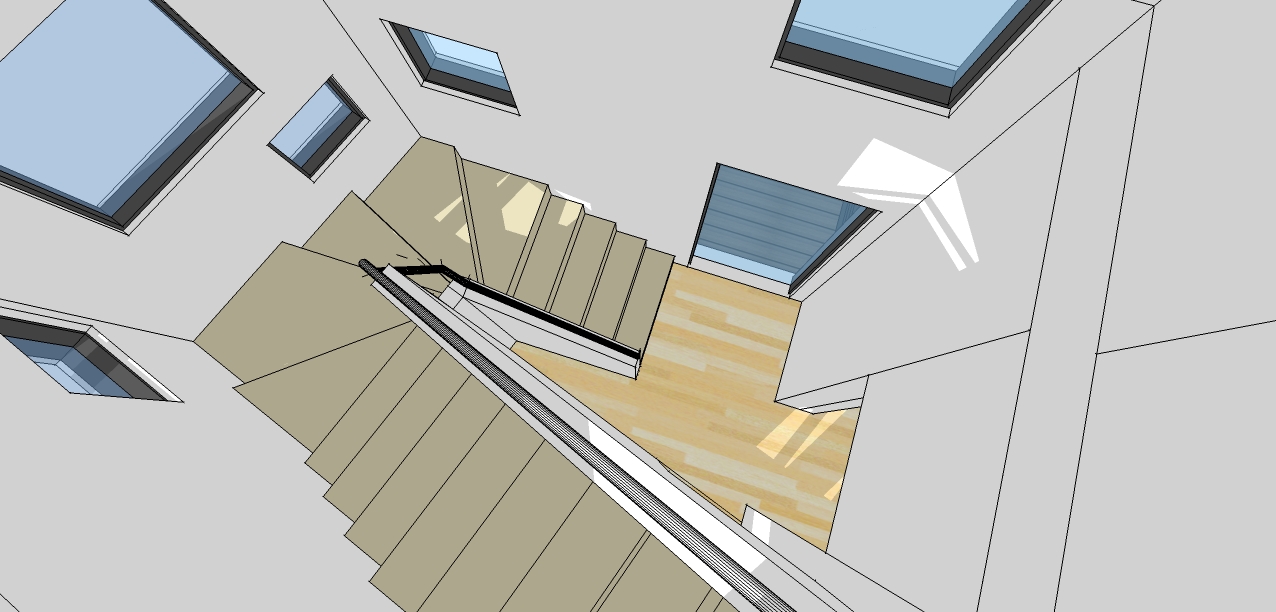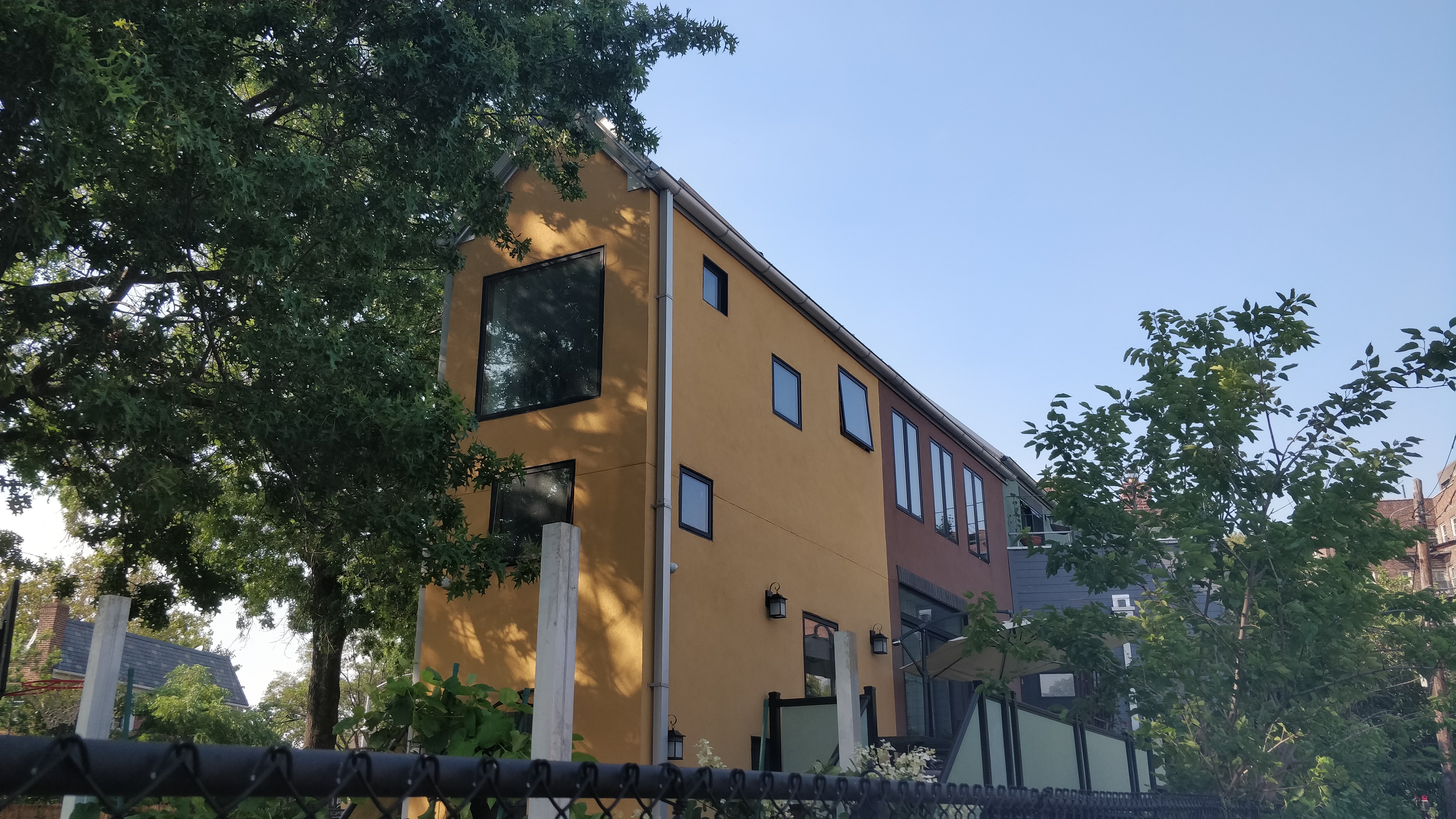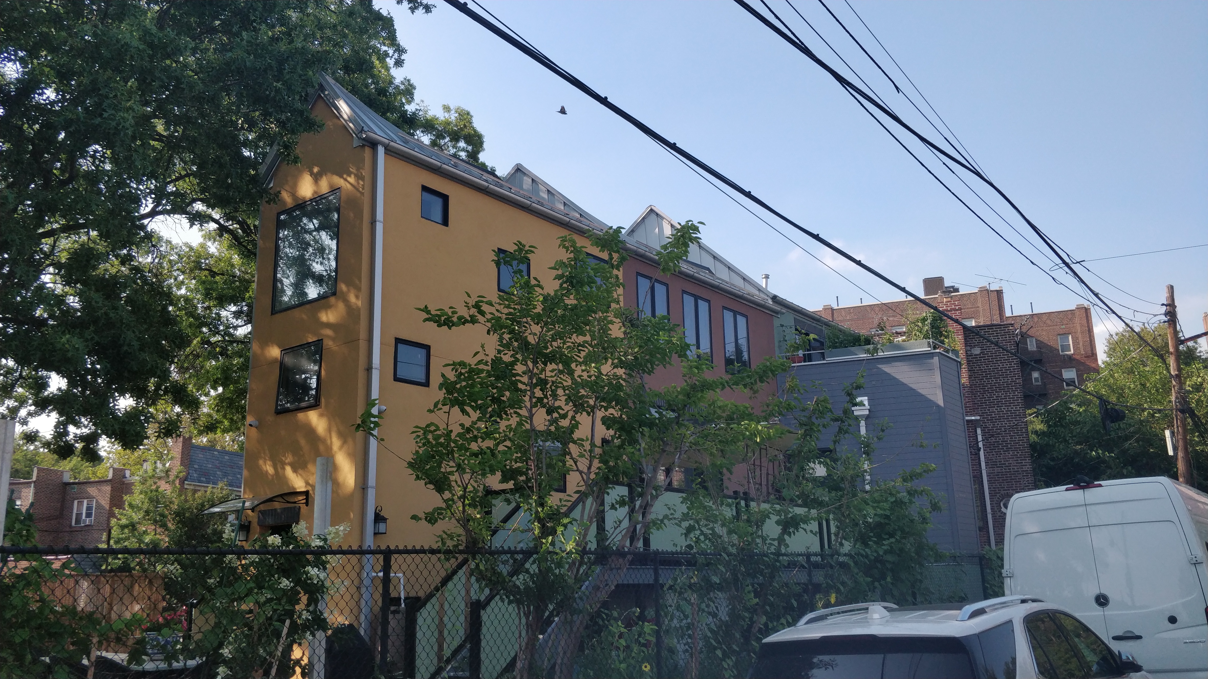 Sunnyside, a neighborhood in Western Queens, is characterized by single-family semi-detached townhouses built primarily in the 1930s. The owner’s main goal was to move in with her daughter and her grandchildren, so they purchased two adjacent lots on Celtic Avenue. Celtic Avenue is unique because it runs diagonally to the neighborhood grid, creating an acute triangular lot at 43rd Street. The irregular shape of the lot presented us with challenges in space planning and in roof design. Our solution was to locate the stair toward the narrow end, and to leave the remaining sliver for the owner’s garden. Inspired by the colorful stucco facades of her hometown, St. Petersburg, Russia, the owner wanted to get away from the monotonous brick houses of Sunnyside. The stucco is done in three colors to break up the elongated massing.