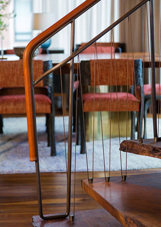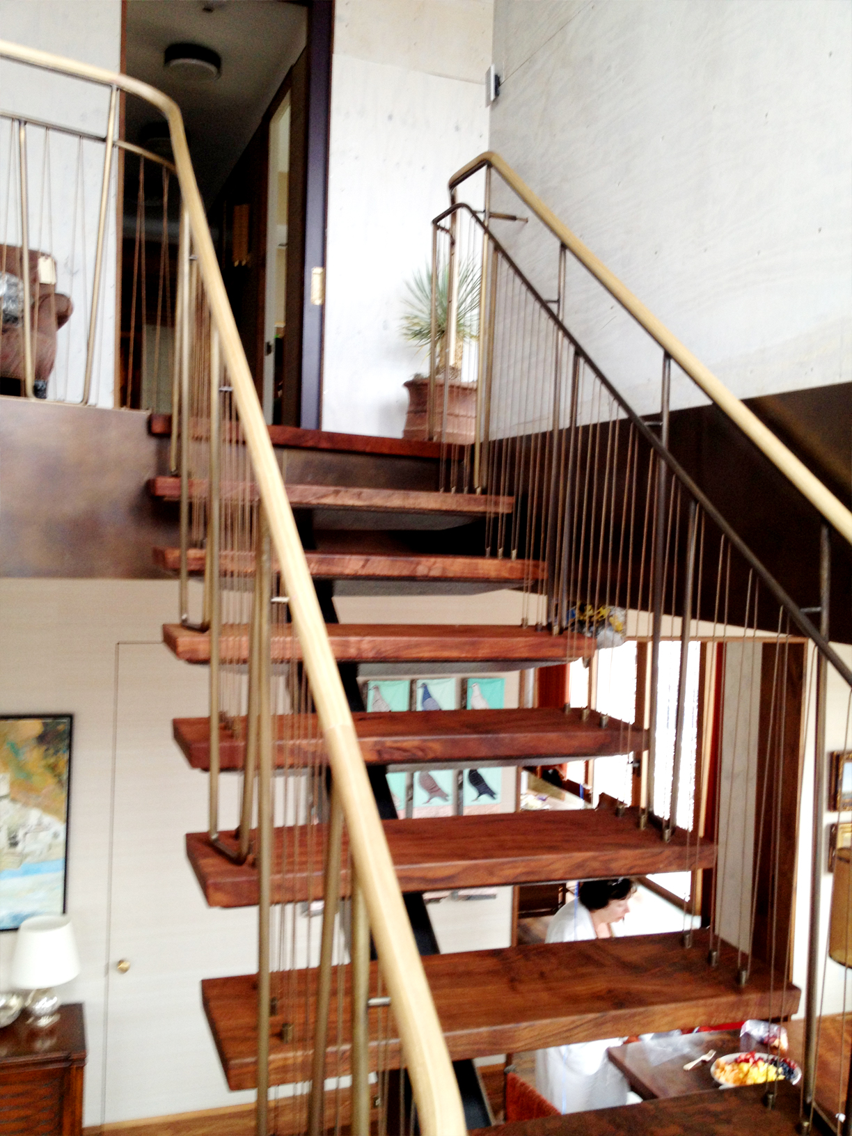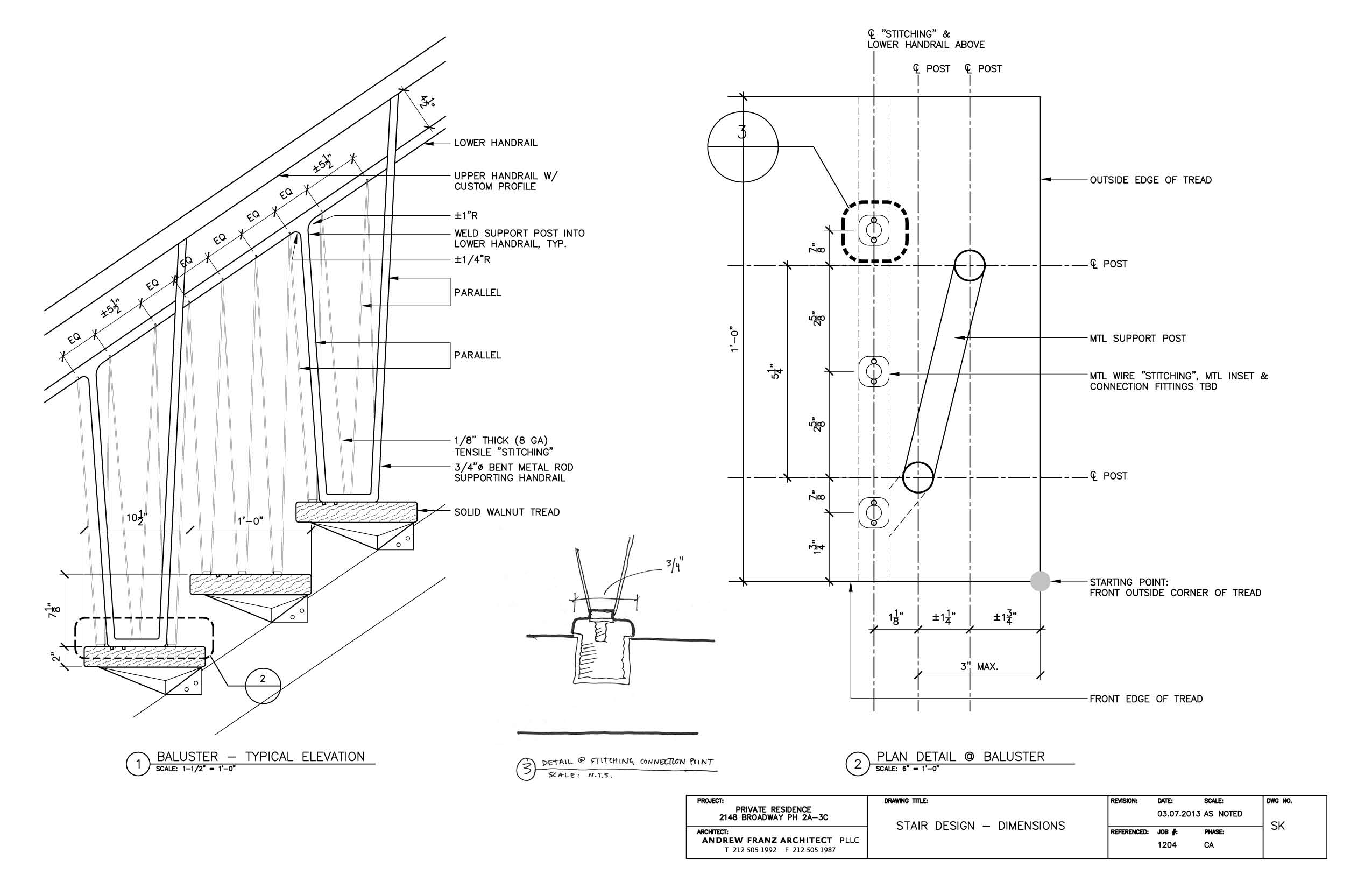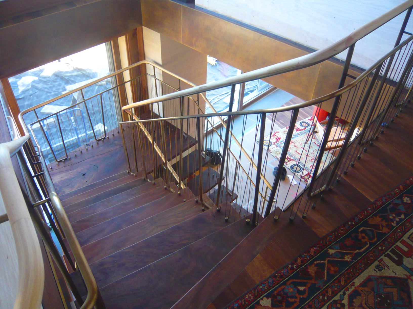 Ivan Himanen led the design and coordinated construction of a new freestanding stair for Andrew Franz Architect’s full renovation of a 3000SF Upper West Side duplex serving a family of six. The stair is significant on a number of fronts. First, it is the primary connection between the “public” and “private” spaces, with dining, living, and family rooms all adjacent. Second, being so prominent, it is designed to expressively reflect the textured lushness of the rest of the apartment. Third, it sits at a particularly critical juncture where a dozen trades intersect. A single 6″ steel tube stringer supports cast bronze shells, each of those in turn holding 2″ thick solid wood treads. The baluster is composed of slanted U-shaped bronze posts and a threaded bronze cable. The handrail is a 2″ diameter cylinder wrapped in leather. Durable for high traffic, generous but not monumental, and meticulously detailed.