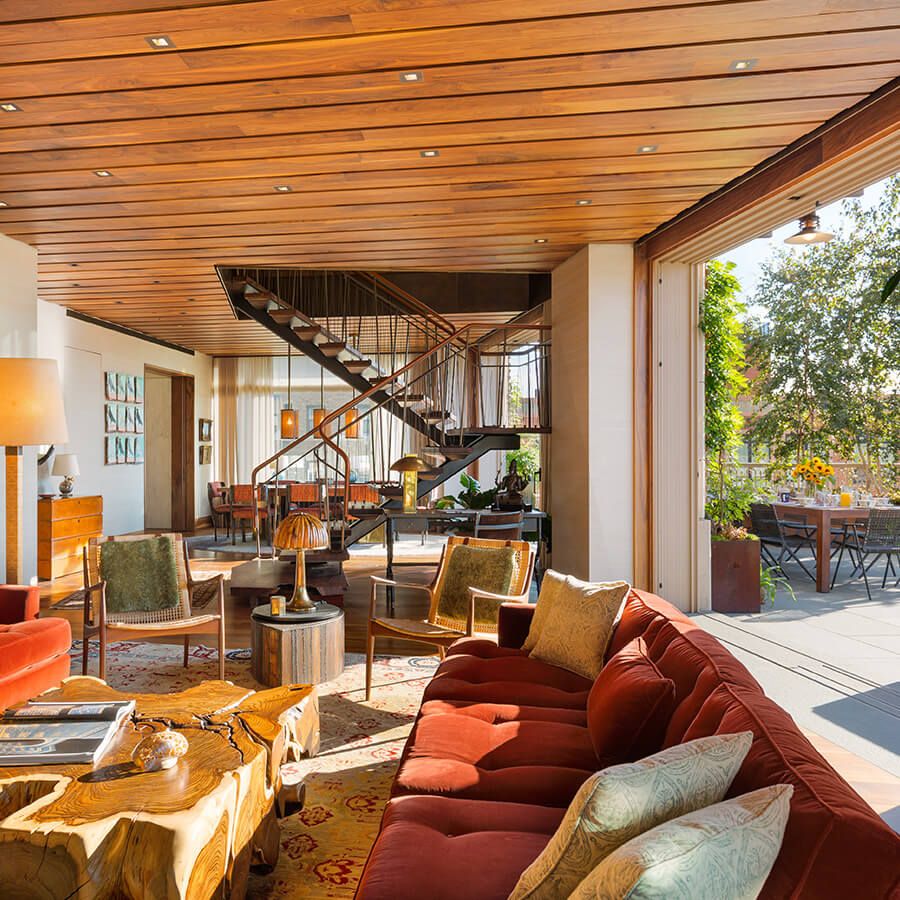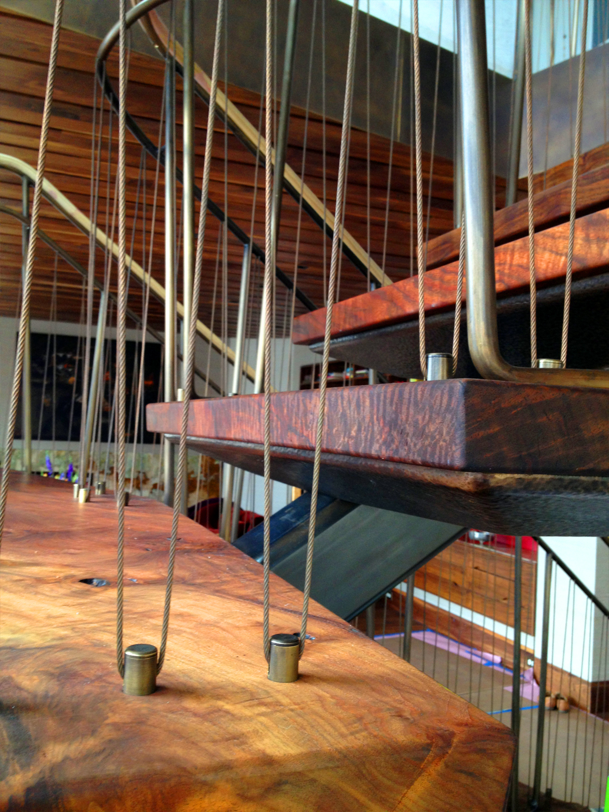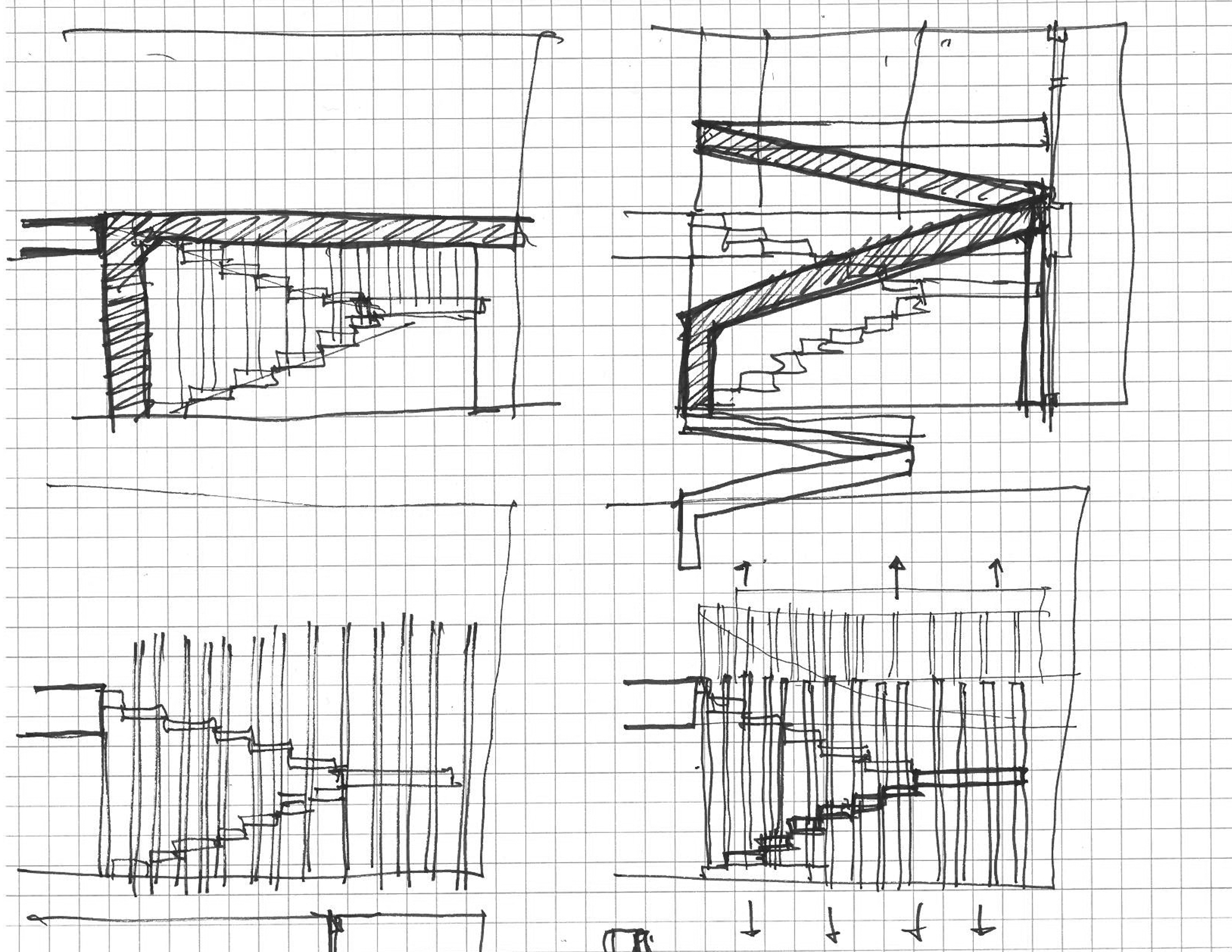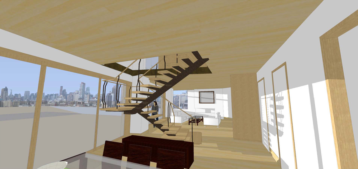 Ivan Himanen led the design and coordinated construction of a new freestanding stair for Andrew Franz Architect’s full renovation of a 3000SF Upper West Side duplex serving a family of six. The stair is significant on a number of fronts. First, it is the primary connection between the “public” and “private” spaces, with dining, living, and family rooms all adjacent. Second, being so prominent, it is designed to expressively reflect the textured lushness of the rest of the apartment. Third, it sits at a particularly critical juncture where a dozen trades intersect. A single 6″ steel tube stringer supports cast bronze shells, each of those in turn holding 2″ thick solid wood treads. The baluster is composed of slanted U-shaped bronze posts and a threaded bronze cable. The handrail is a 2″ diameter cylinder wrapped in leather. Durable for high traffic, generous but not monumental, and meticulously detailed.